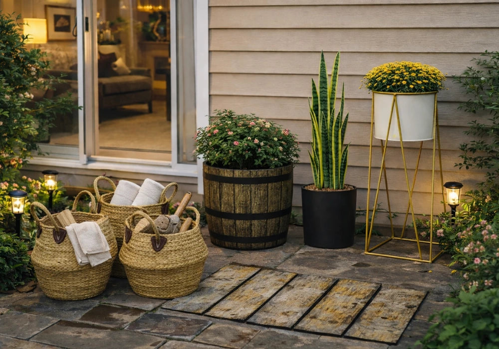 Canastos: guarda mantas, cojines o juguetes de exterior; manténlos alejados de lluvia directa.