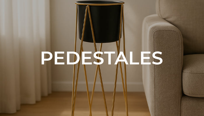 Maceteros & pedestales: blancos/negros para un look limpio; cemento para toque industrial; metal para brillo moderno.