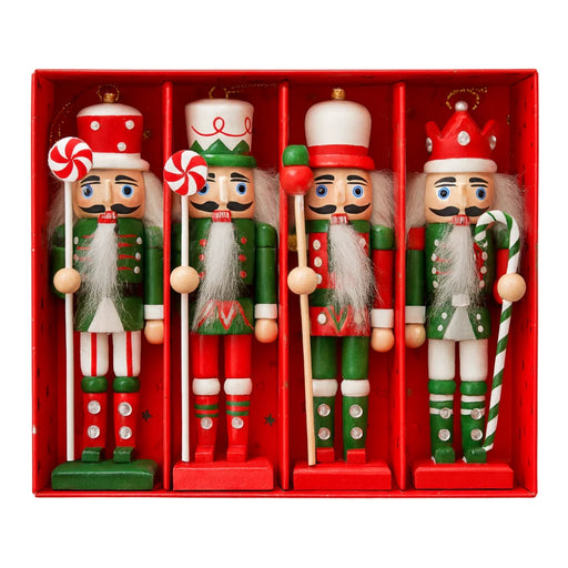 Set de 4 cascanueces de madera de 13 cm, un clásico adorno navideño lleno de encanto y tradición. Cada figura está cuidadosamente pintada con detal...
